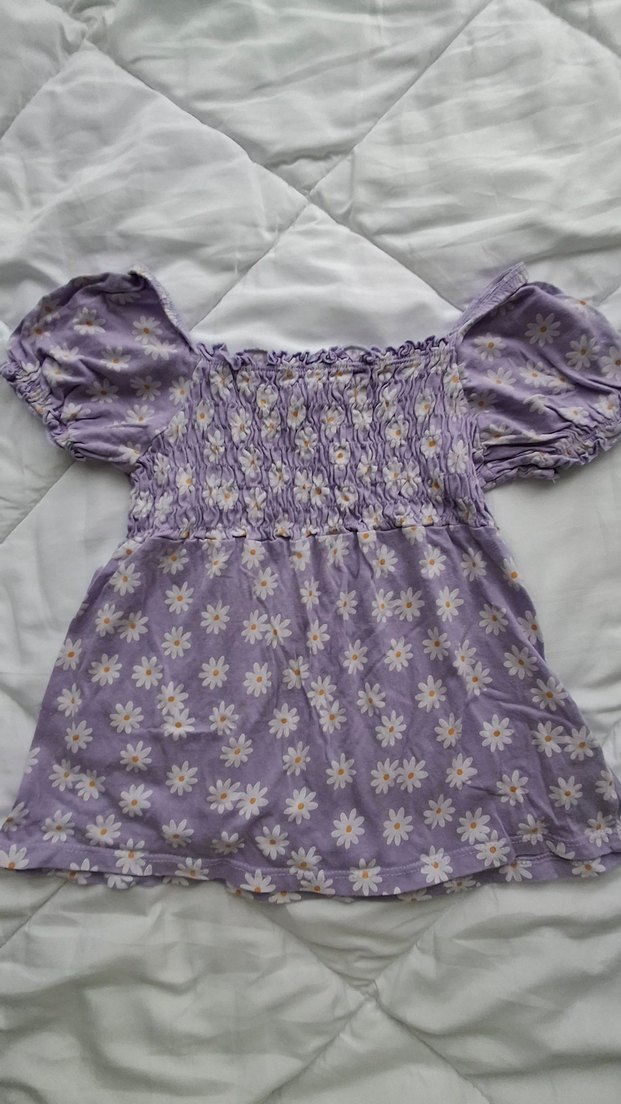 Mor straplez kısa balon kollu, bol kesim ve fırfırlı örme kumaşlı, papatya desenli bohem tarzda kız bluzu . yazlık kullanıma uyundur. kullanılmamıştır.
