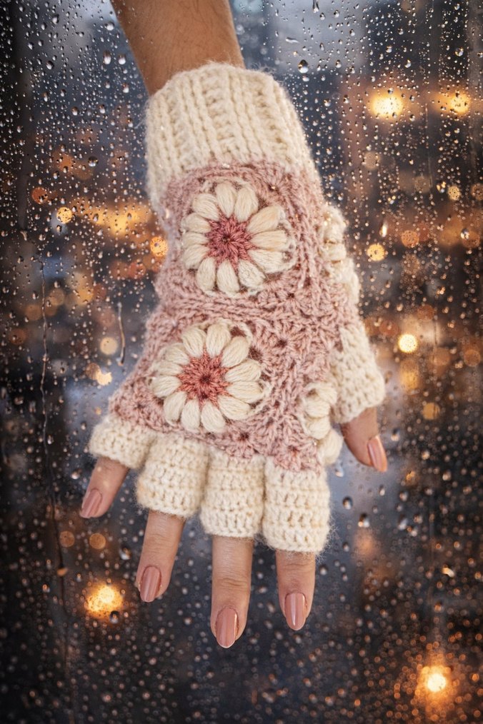 Bohem tarzda, beyaz ve pembe pastel renklerde, çiçek desenli örgü parmaksız kadın eldiveni.
