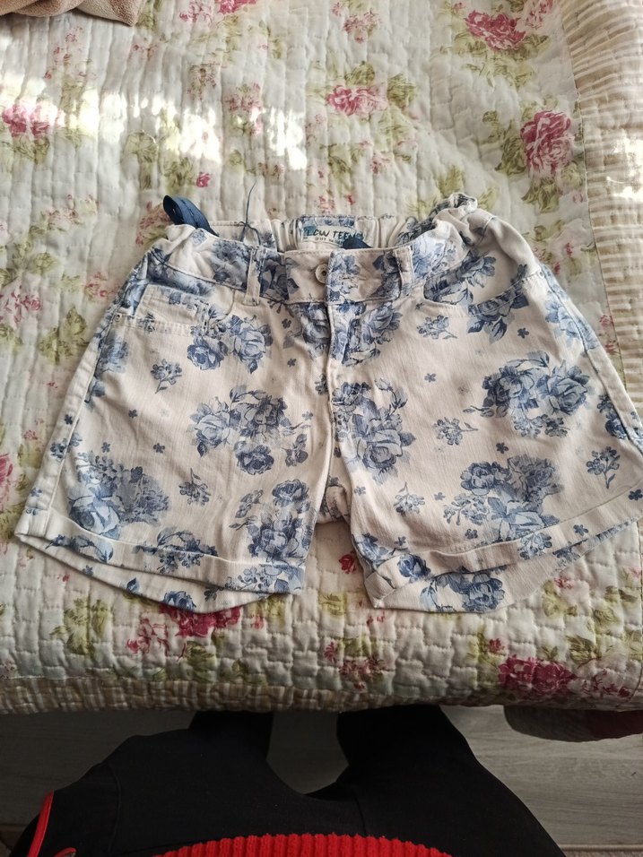 Bohem tarzı, düğmeli, beyaz pamuklu ve pastel çiçek desenli bol kesim kız şortu.