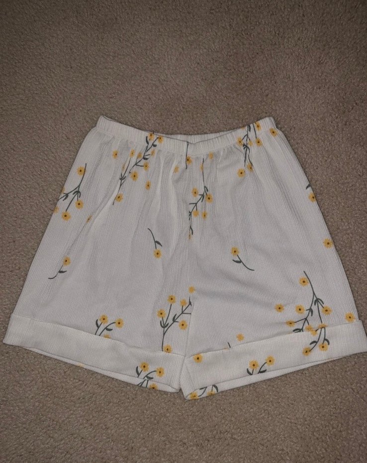 Yumuşak pamuklu kumaştan, bol kesim, pileli ve beyaz-sarı çiçek desenli mini şort. Rahat ve bohem bir tarz için uygundur.