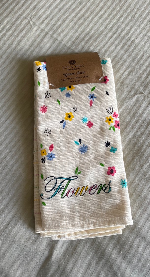 Beyaz zemin üzerinde pastel renklerde çiçek desenleri bulunan bohem tarzda yumuşak kumaş havlu. Üzerinde 'LUCASERA Flowers' yazısı yer alır.