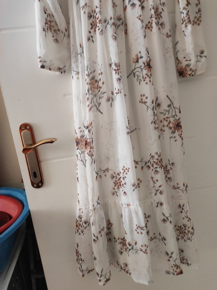 Bu beyaz bohem uzun elbise, gevşek kesim, kayık yaka ve askılı kollarla dikkat çeker. Hafif çiçek desenli, dökümlü sentetik kumaştan üretilmiştir.