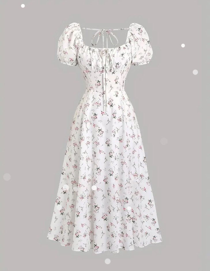 Pamuklu kumaştan yapılmış, uzun ve bol kesim elbise. Kısa kabarık kollu, pastel çiçek desenli vintage bohem tarzda. Hiç kullanılmadı.