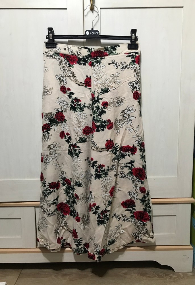 Çiçek desenli, drapeli, bol kesim uzun kadın pantolon. Sentetik kumaştan, bohem tarzda, gri ve beyaz tonlarda.