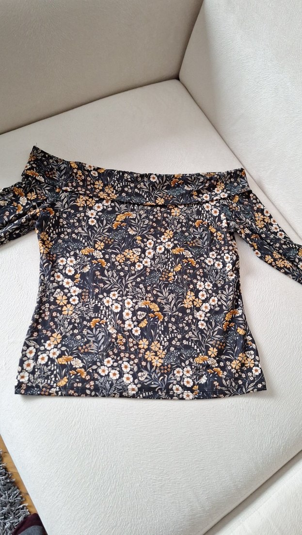 Kadınlar için kayık yaka, uzun kollu, bol kesim, koyu gri çiçek desenli bluz. Yumuşak sentetik kumaştan, düğmeli detaylı, bohem tarzda. Günlük kullanım için uygun.