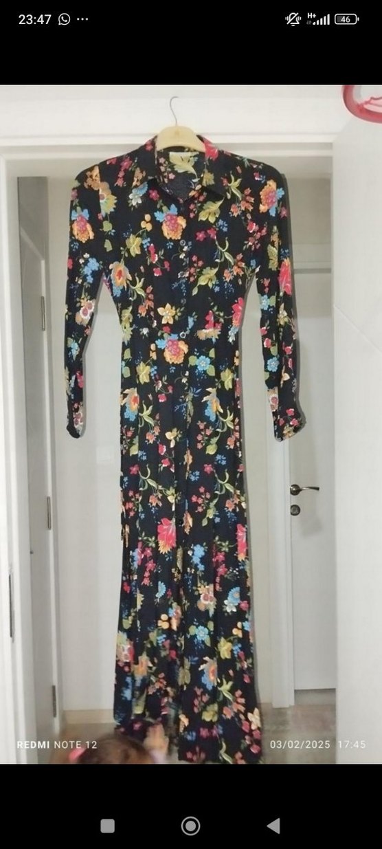 Koyu renkli çoklu çiçek desenli, uzun kollu, V yakalı ve düğmeli bohem tarzda, sentetik kumaştan yapılmış dar kesim uzun elbise.