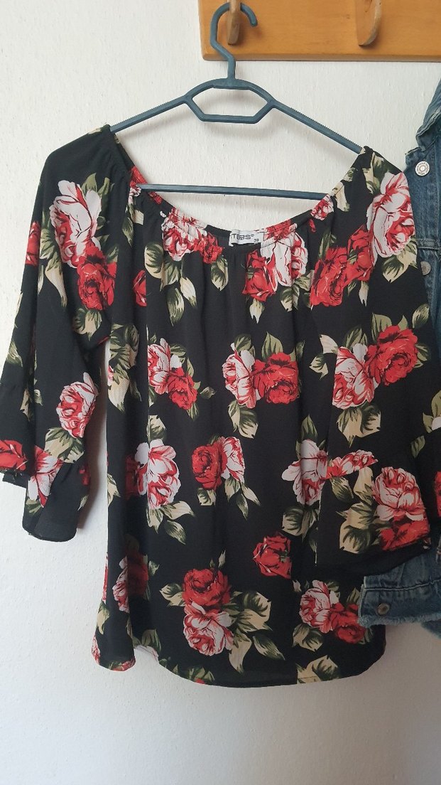Bohem tarzda, uzun kollu, düğmeli, çiçek desenli bol kesim kadın bluz. Günlük sokak stiline uygun, koyu kırmızı tonlarında.
