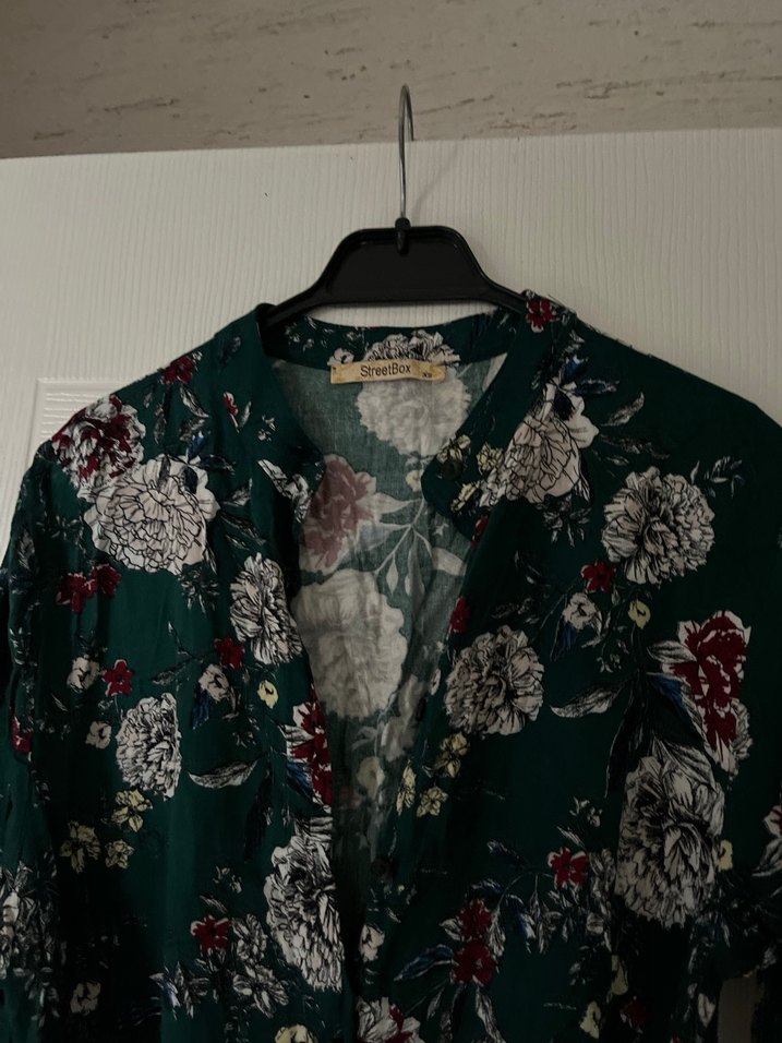 Koyu yeşil, uzun kollu, bol kesim, düğmeli ve V yaka çiçek desenli sentetik kumaştan gömlek.