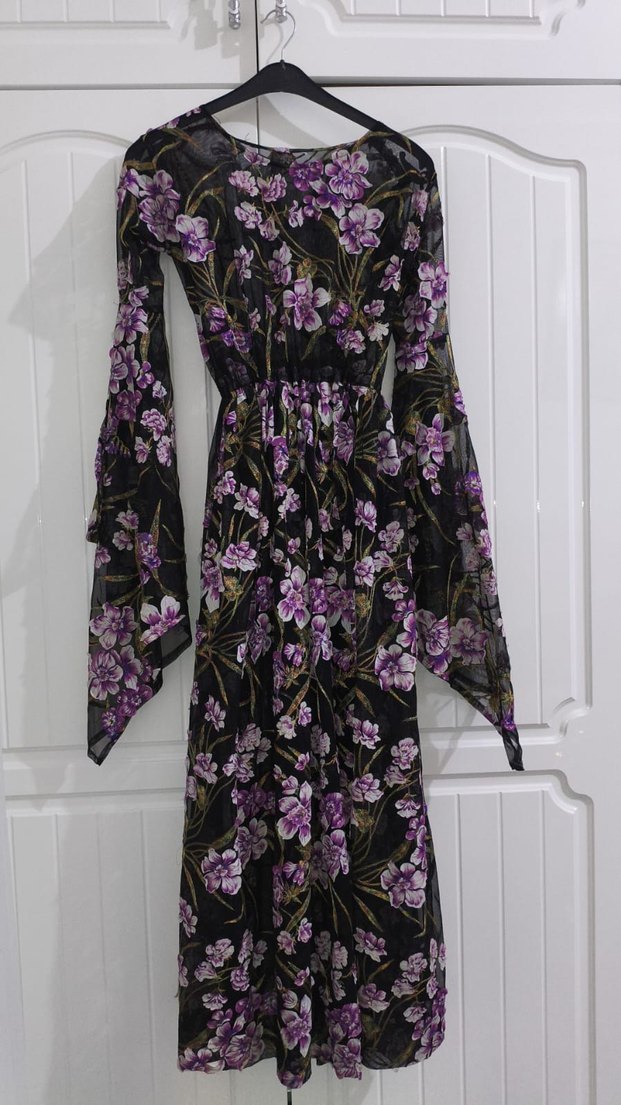 Bohem tarzda, mor çiçek desenli uzun elbise. Drapeli, askılı kollar ve V yakaya sahip, bol kesim ve sentetik kumaştan yapılmıştır.