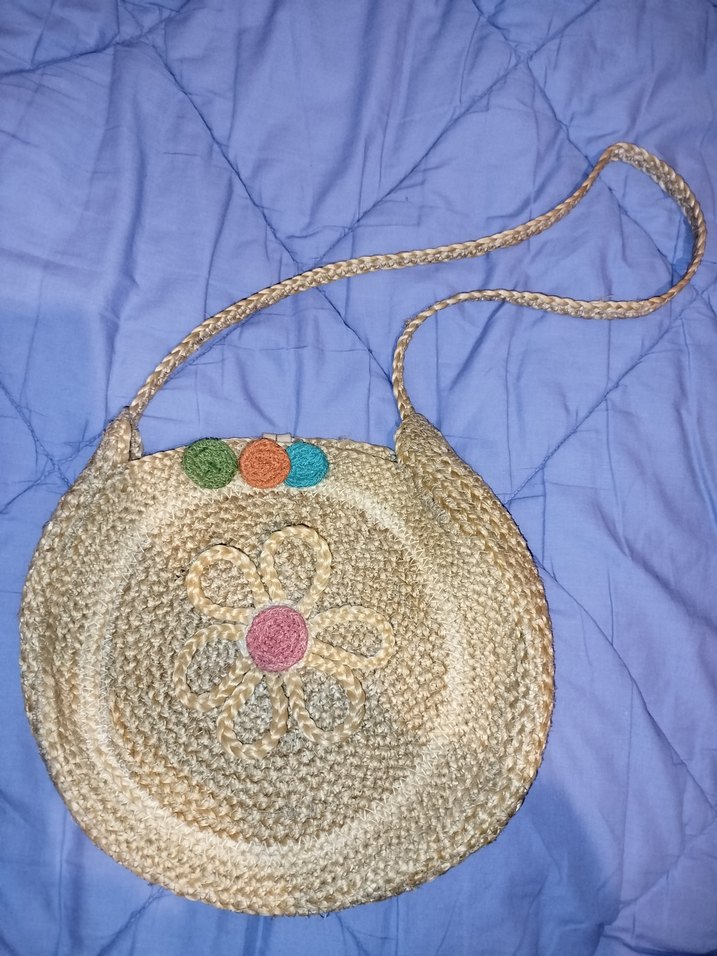 Bohem tarzda, yuvarlak hasır örgü kadın çantası, çiçek detaylı ve renkli hasır boncuk detaylarına sahiptir, günlük kullanım için uygundur. Ürünün arka tarafında ufak bir defo mevcuttur fotoğraflarda belirtilmiştir.