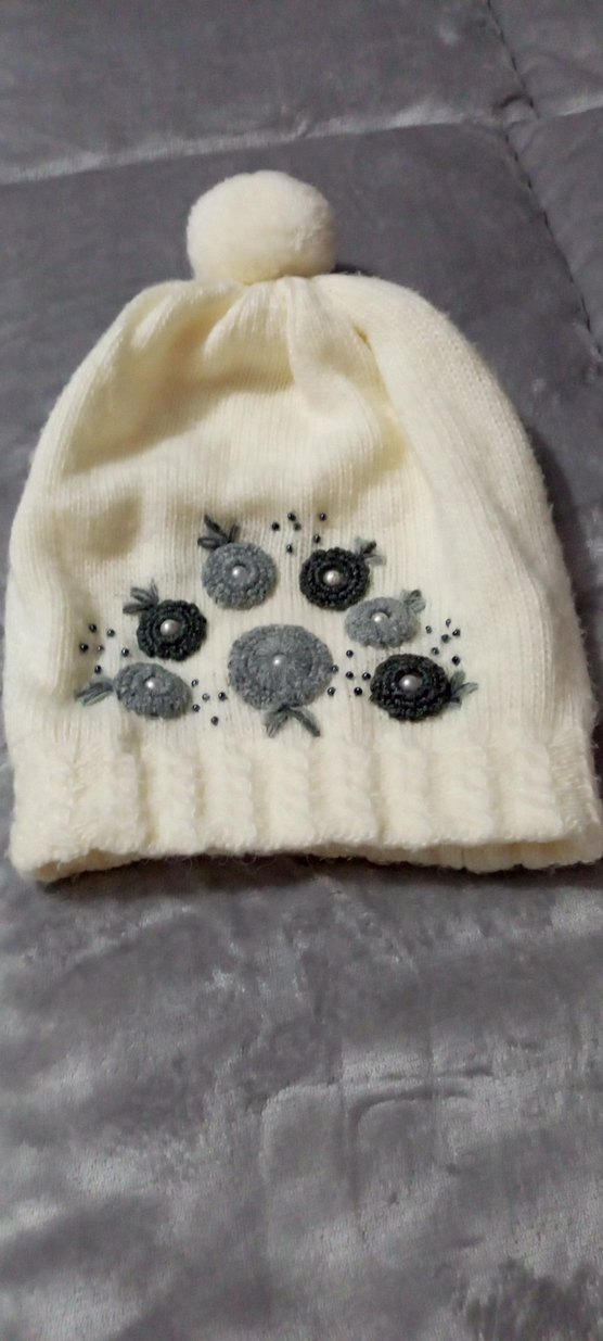 Bu beyaz örme bere, bohem tarz için gri çiçek işlemeleri ve küçük boncuk detaylarıyla sıcak bir tasarıma sahiptir. el ögüsü Çelik bere
