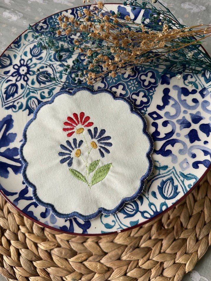 Bohem tarzda renkli çiçek nakışlı, dalgalı kenarlı dekoratif peçete. İstenilen renk yapılır toplu sipariş alınır