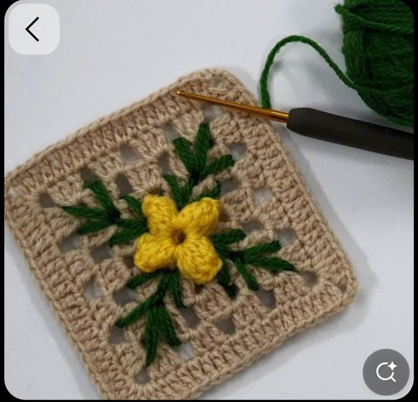 Yumuşak iplikten yapılmış bej zemin üzerinde yeşil yapraklı sarı çiçekli bohem tarzda el örgüsü kare motifi.