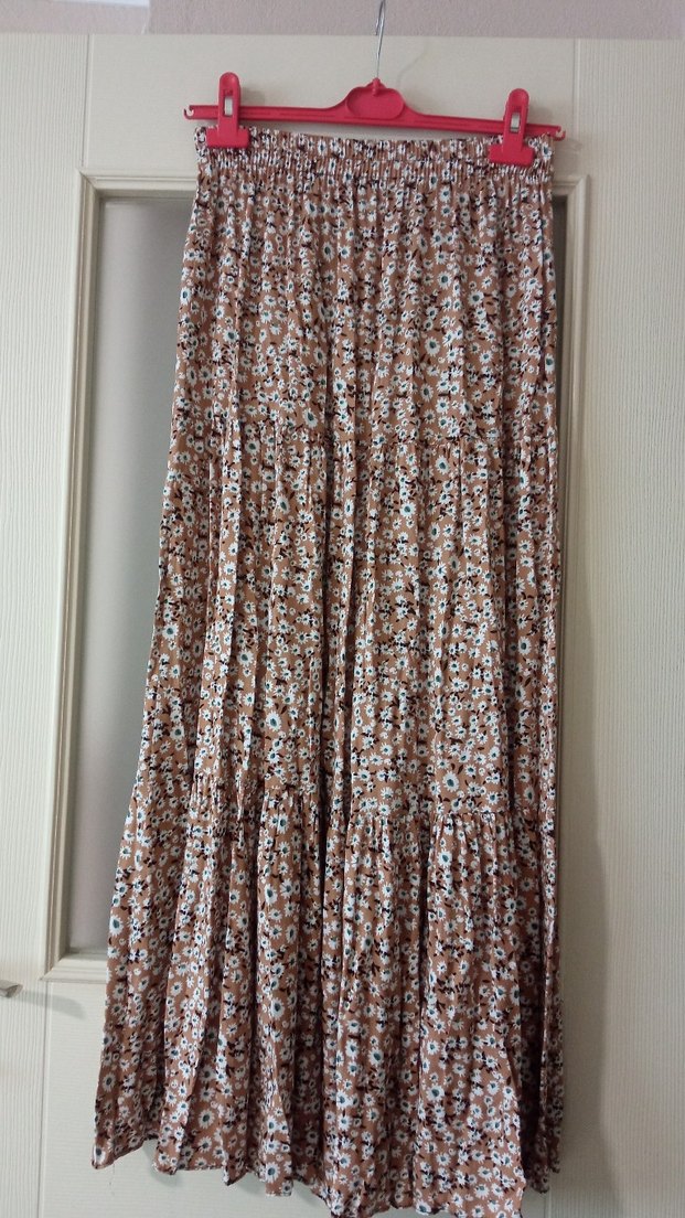 Uzun, üç katlı ve bol kesimli bohem tarzda, kahverengi desenli çiçekli uzun etek. Günlük kullanım için uygundur. Beden 38 S/M uyumludur. Beli lastikli 32 cm 48 cm'e kadar genişler. Buradan aldım, hiç giymedim, yenidir.
