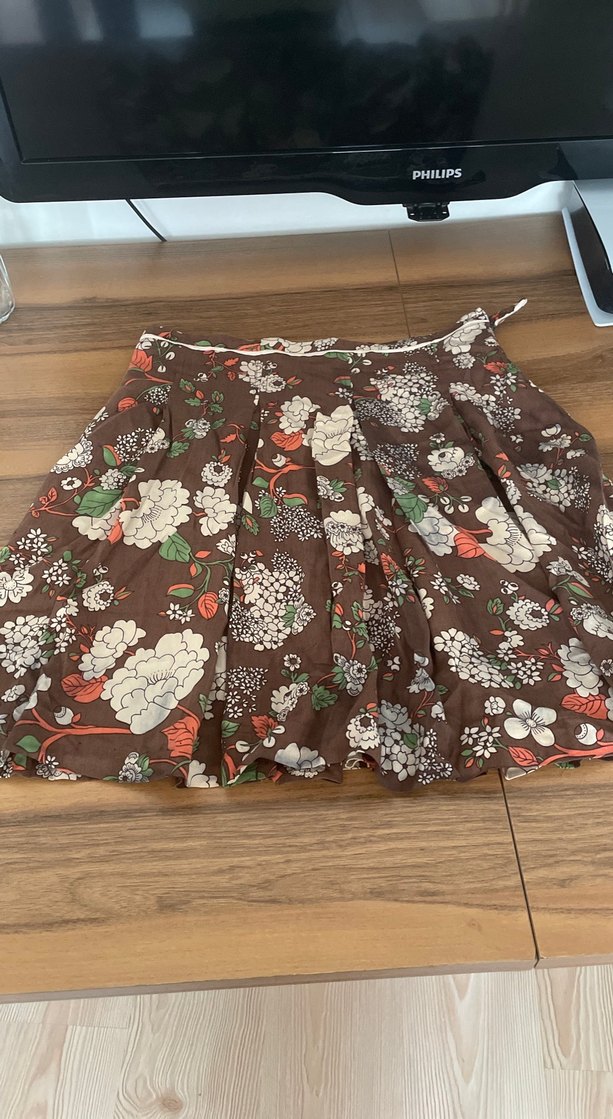 Kahverengi, vintage çiçek desenli, bol kesim ve pileli midi, bohem tarzı için uygun.