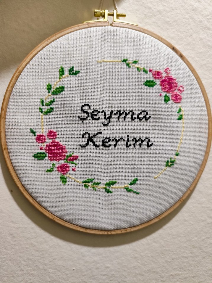Bohem tarzda, pembe çiçekler ve yeşil yapraklarla çevrili Seyma ve Kerim isimlerinin işlendiği nakış kasnağı. kişiye Özel hazirlanir