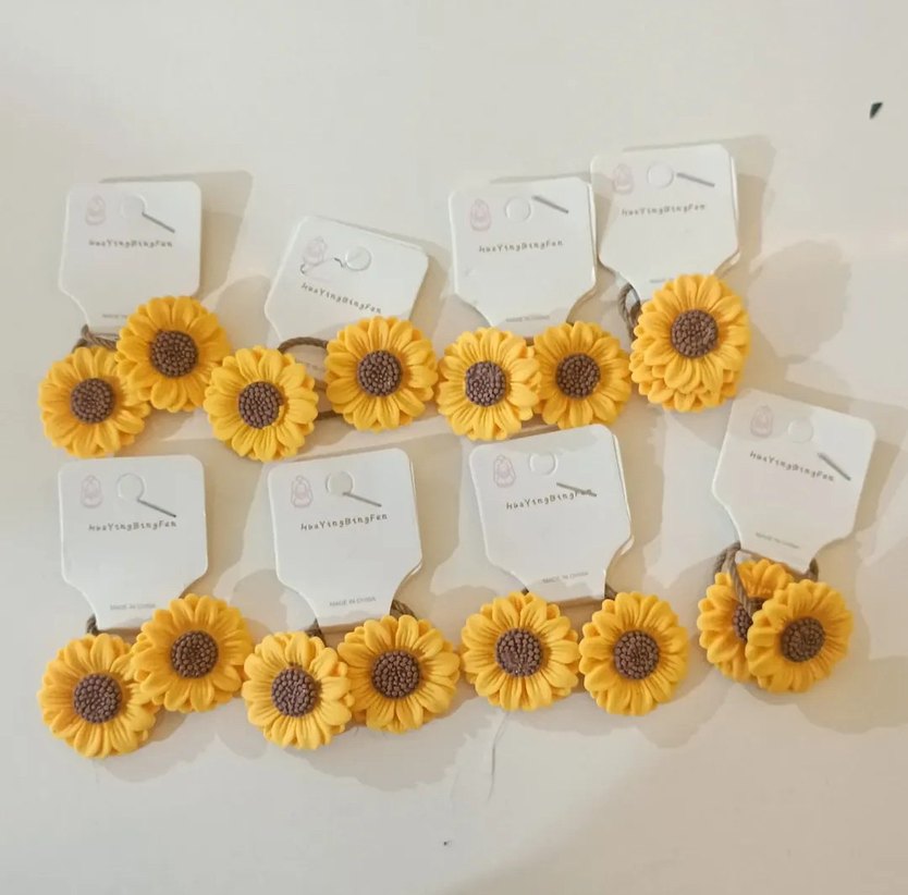 Sarı, lastikli, ayçiçeği desenli renkli çocuk saç tokaları, bohem tarz için uygundur.
