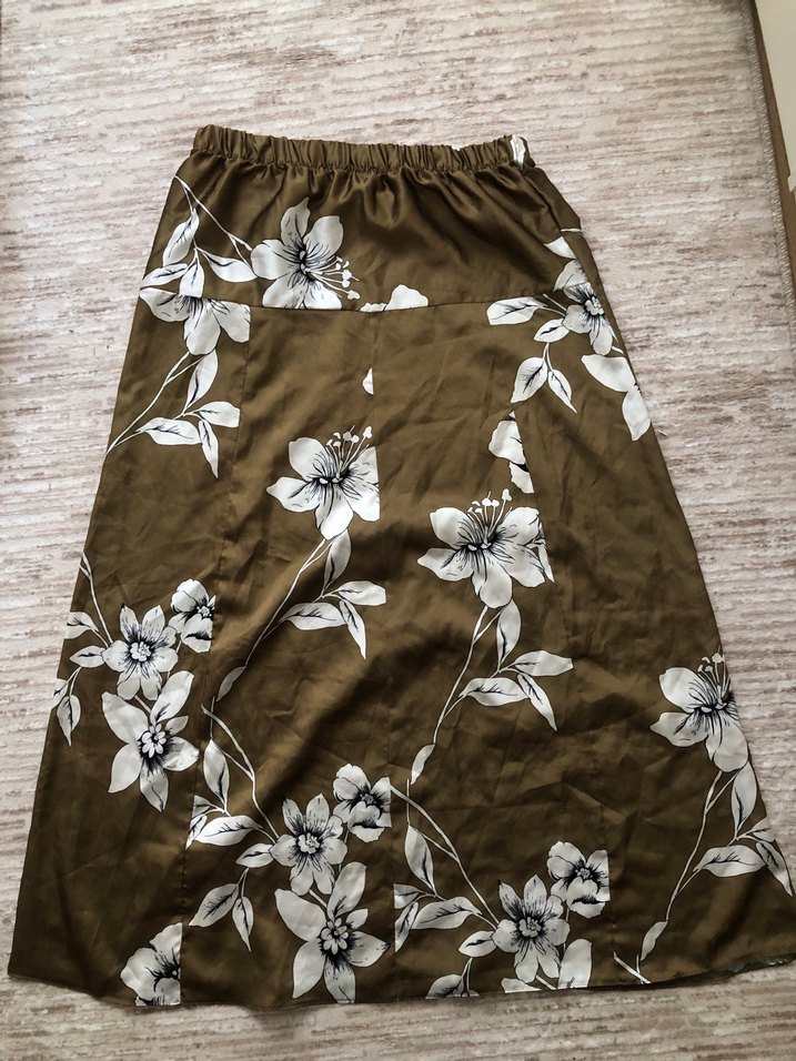 Bu uzun, bol kesim etek drapeli tasarıma sahip olup koyu kahverengi zemin üzerinde beyaz çiçek desenleri vardır. Yumuşak sentetik kumaştan yapılmıştır, bohem stil için uygundur.