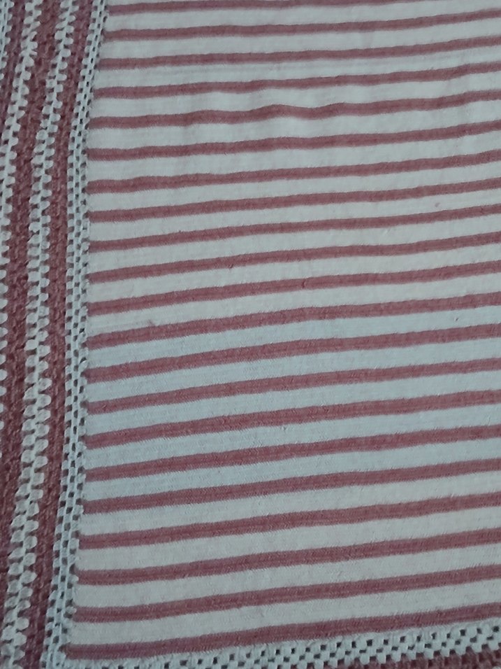 Bej ve gri çizgili, bohem tarzda masa örtüsü. İnce dantel kenarlıklı, masanıza zarif bir dokunuş katar.