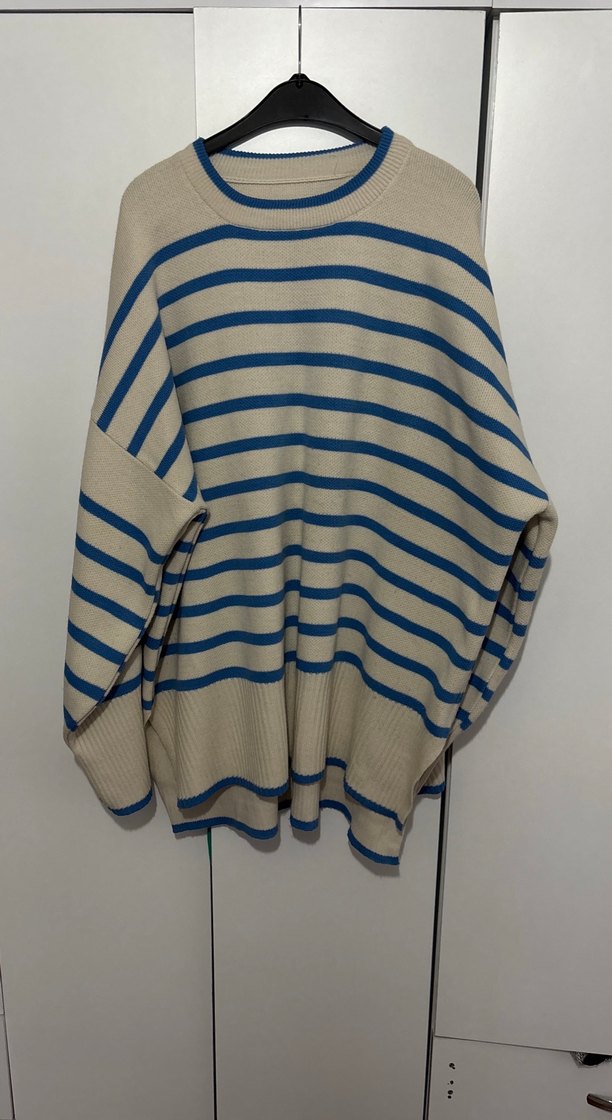 Bohem tarzda, gevşek kesim, bej renkli örgü kazak. Pastel mavi çizgiler, yuvarlak yaka ve askılı kollara sahiptir. Günlük kullanıma uygundur.