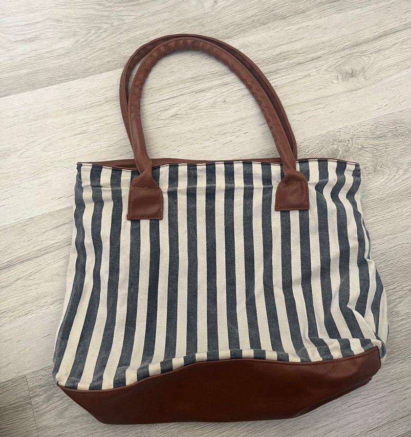 Bu kadın çantası, kahverengi sentetik kumaş saplar ve taban ile çizgili desene sahiptir. Fermuarlı kapama özelliği bulunur, bohem ve Paris tarzına uygundur. Günlük kullanıma idealdir.