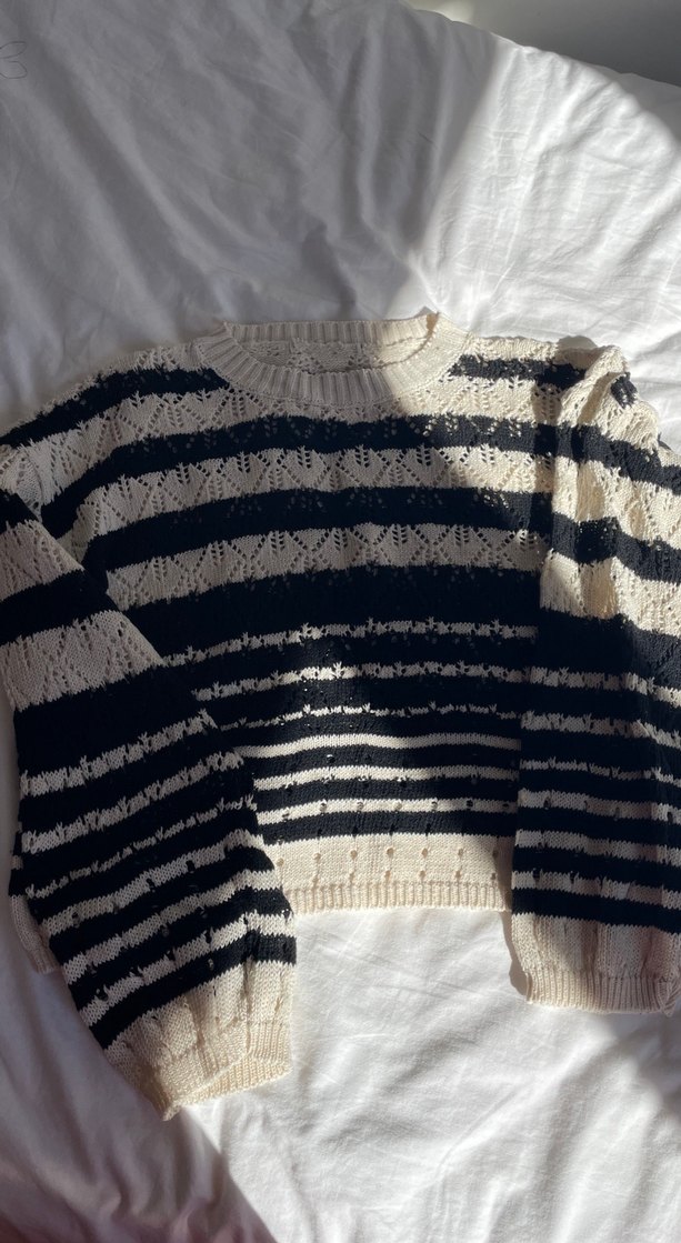 Uzun kollu, yuvarlak yaka, bol kesim ve normal boyda kadın kazak. Koyu beyaz tonlarda çizgili örgü deseniyle rahat ve bohem tarzda, günlük kullanıma uygun.