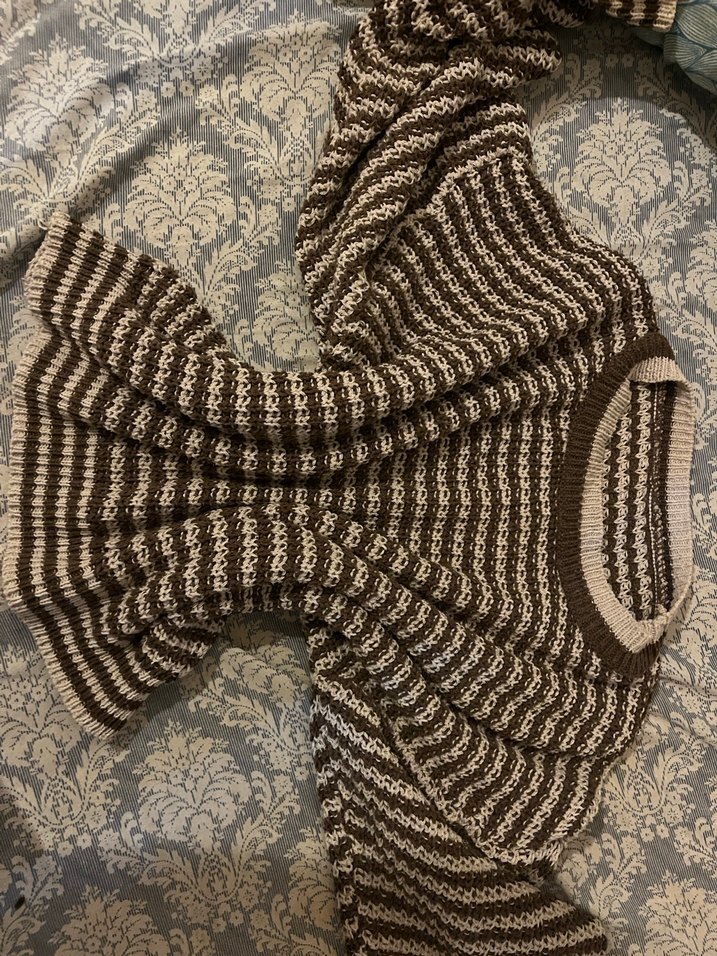 Kahverengi ve gri çizgili örgü kazak, tekne yaka ve uzun kolludur. Bol kesim ve normal midi boy ile bohem tarzda rahat bir seçenektir. Bir kaç söküğü var ekledim resimlerde var fiyattan düştüm