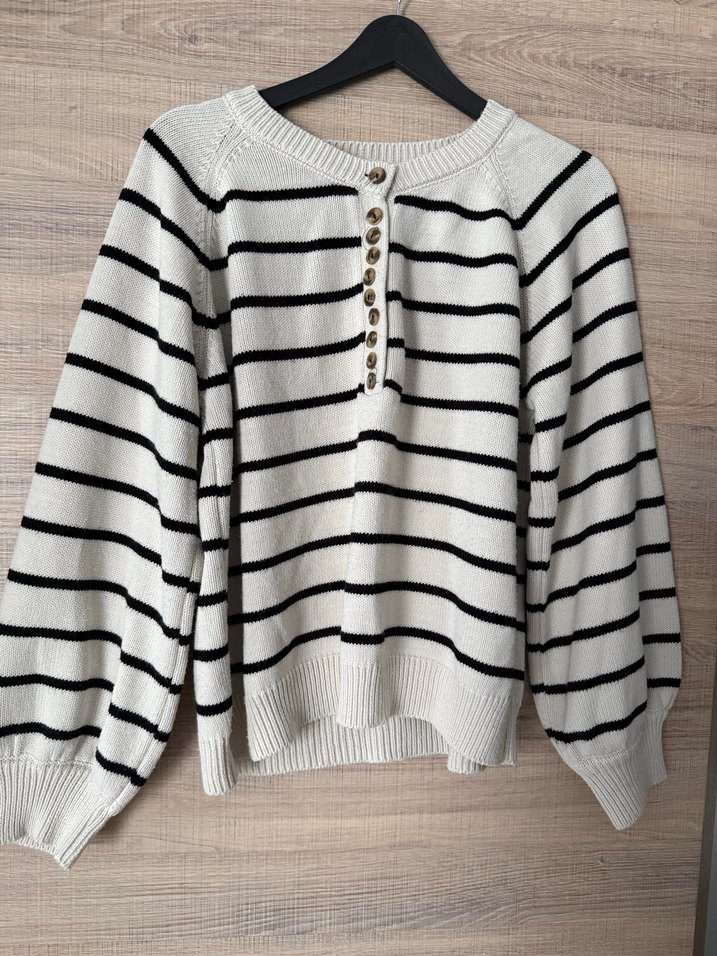 Bohem tarzda, uzun kollu ve yuvarlak yakalı, beyaz ve siyah çizgili örgü kadın kazak. Düğmeli ön detaylı, rahat kesim, günlük kullanıma uygun.