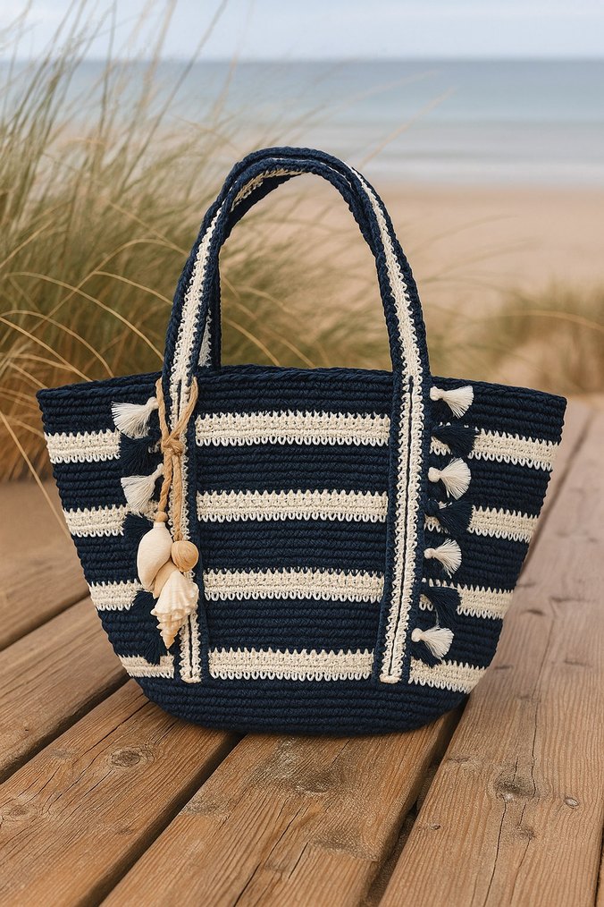 Bohem tarzda, siyah ve ekru çizgili, püskül detaylı örgü kadın çanta. Kağıt iple yapılmış,günlük kullanıma ve veya plaja uygun, retro havası olan bir model. en:59 boy:35 kendi el yapımımdır.