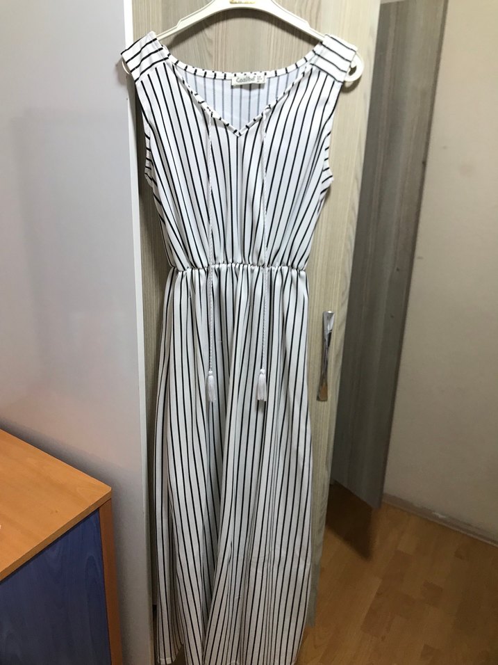 V yaka, kolsuz ve pileli uzun elbise. Beyaz ve gri çizgili, bol kesimli ve sentetik kumaştan, günlük kullanıma uygun bir kez giyildi