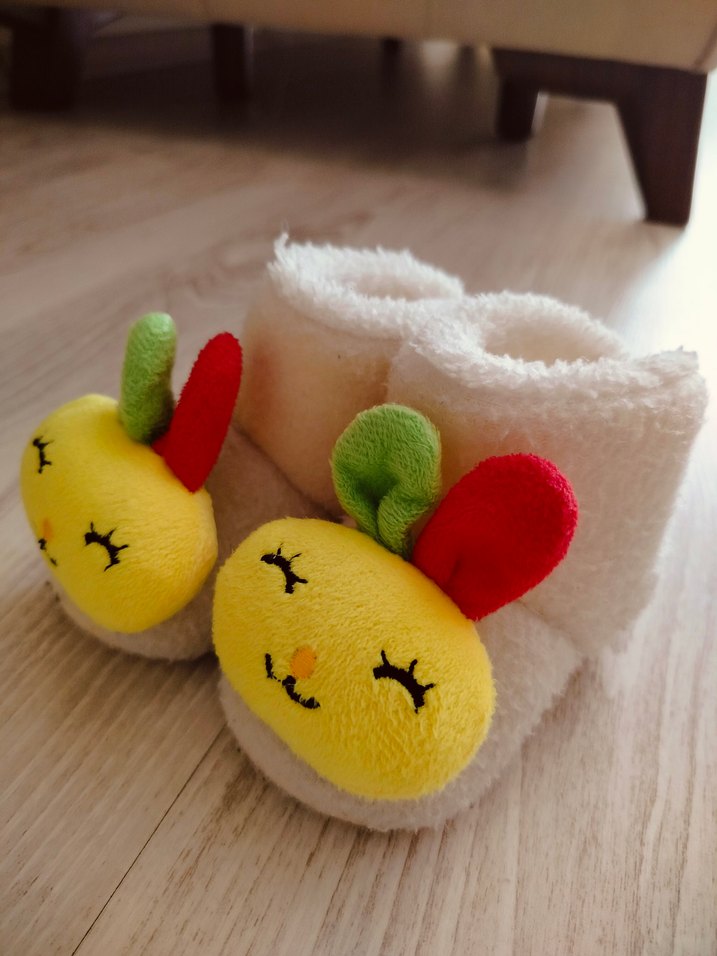 Yumuşak ve sıcak dokulu beyaz, örgü çocuk terliği, renkli nakışlar ve önünde oyuncu peluş yüz detaylarıyla bohem tarzda. Küçük geldiği için ev içinde birkaç kez giyildi.
