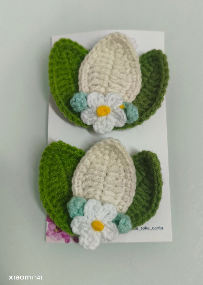 İki adet beyaz çiçek ve renkli yeşil yaprak detaylı örgü çocuk saç tokası seti, bohem tarz için uygun. istenilen renkte sipariş verebilirsiniz