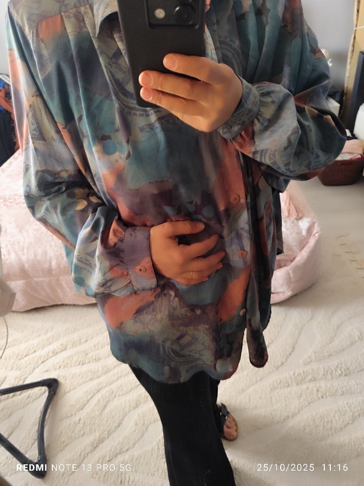 Bohem tarzda, çok renkli bağlama desenli, uzun kollu ve yüksek yakalı bluz. İpek gibi kumaştan, midi boyda ve bol kesimdir. Günlük kullanım için uygundur.
