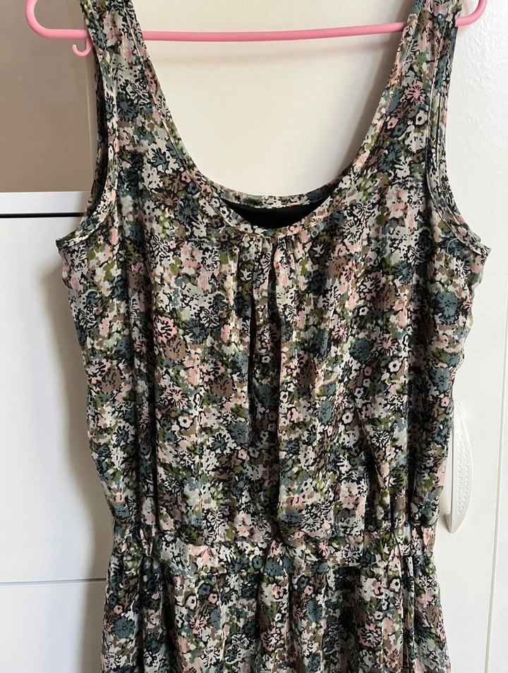 Bohem tarzda, askısız ve kolsuz, bol kesim hamile tulumu. Gri ve çok renkli çiçekli batik desenli, fırfır detaylı, günlük kullanıma uygun.