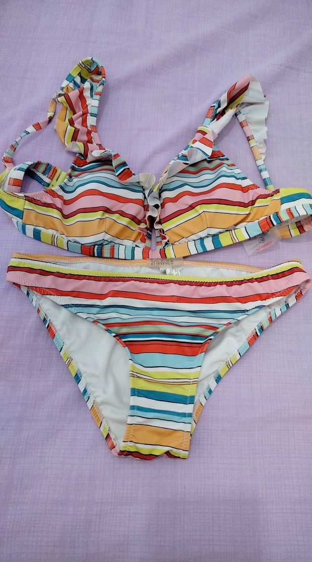 Bohem tarzda, pastel tonlarda bağcıklı ve elastik detaylı, normal boyda çok renkli çizgili bikini. Plajda rahat kullanım için ideal.