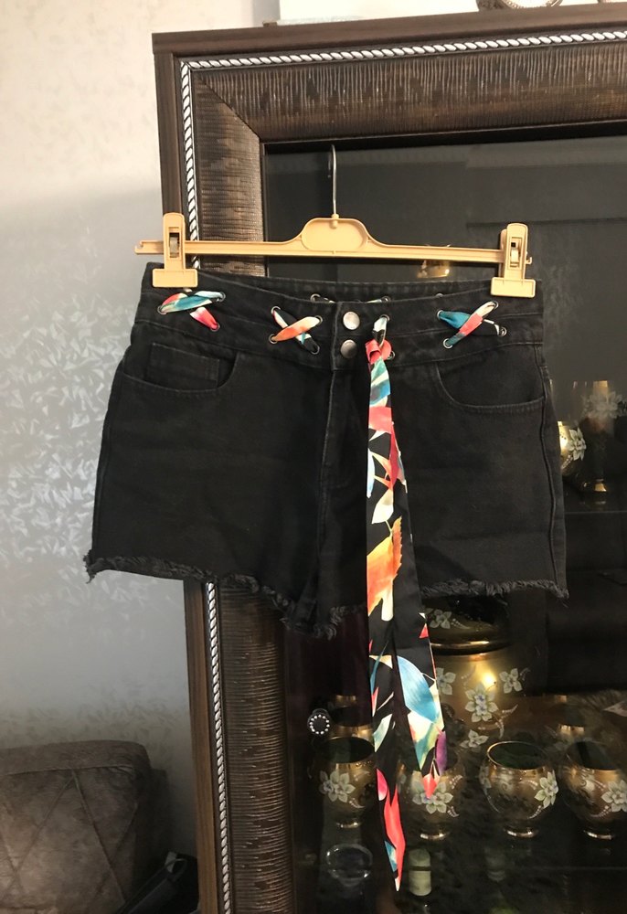 Geçişli bağcıklı renkli kemer detaylı, bol kesim koyu renk kot şort. Bohem sokak stili için uygun, günlük kullanıma ideal.