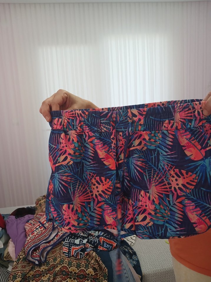 Bol kesim, çok renkli bağcıklı mini şort, canlı batik desenli ve fermuarlı detaylıdır.