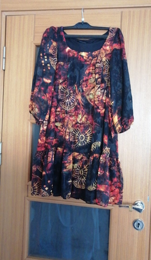 Bohem tarzda, straplez yakalı ve uzun kollu, fırfırlı detaylı hamile tunik. Bol kesim, koyu çok renkli bağlama desenli, romantik akşamlar için uygun.