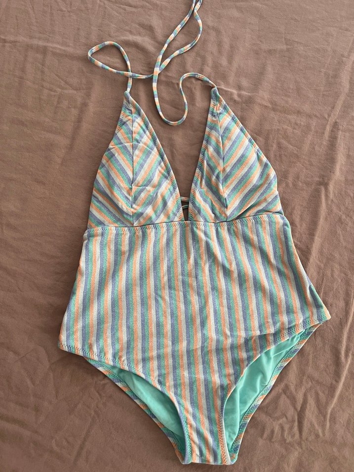 Pastel çok renkli, bağlamalı askılı ve batik desenli, bohem tarzda, vücuda oturan plaj mayosu.