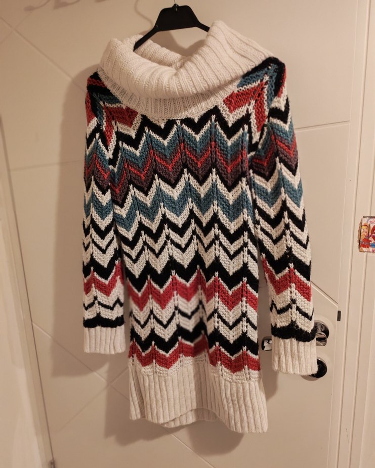 Fitted kesim, uzun kollu ve uzun boylu kadın kazak, rahat triko kumaştan üretilmiştir. Çok renkli desenli ve balıkçı yaka, bohem tarzını yansıtır.