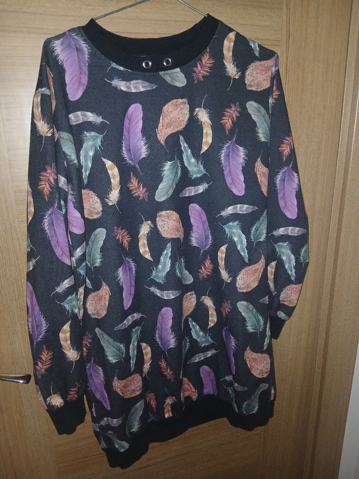 Uzun kollu, yuvarlak yaka, bol kesim hamile kazağı. Çok renkli tüy baskılı, midi boy ve drapeli, bohem sokak stili için uygundur.