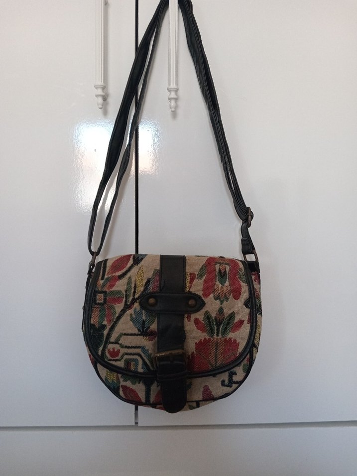Bohem tarzda çok renkli baskılı tekstil malzemeden yapılmış, tokalı kapaklı ve ayarlanabilir askılı kadın çantası. Günlük kullanıma uygundur.