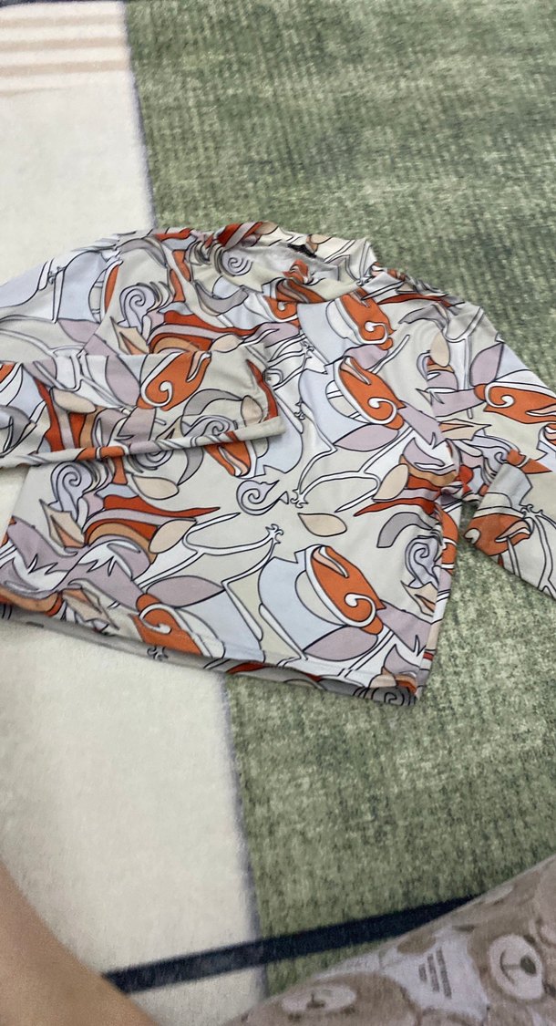 Bohem tarzı çok renkli baskılı kadın gömlek, bol kesim ve drapeli tasarıma sahip. Uzun kollu, boğazlı ve kısa boydadır.
