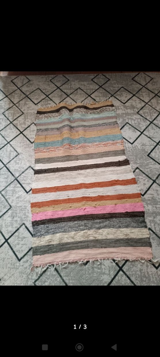 Bohem tarzda, gri tonlu çok renkli batik desenli ve püsküllü kenarlara sahip halı. Mekâna canlı ve sanatsal bir hava katar.
