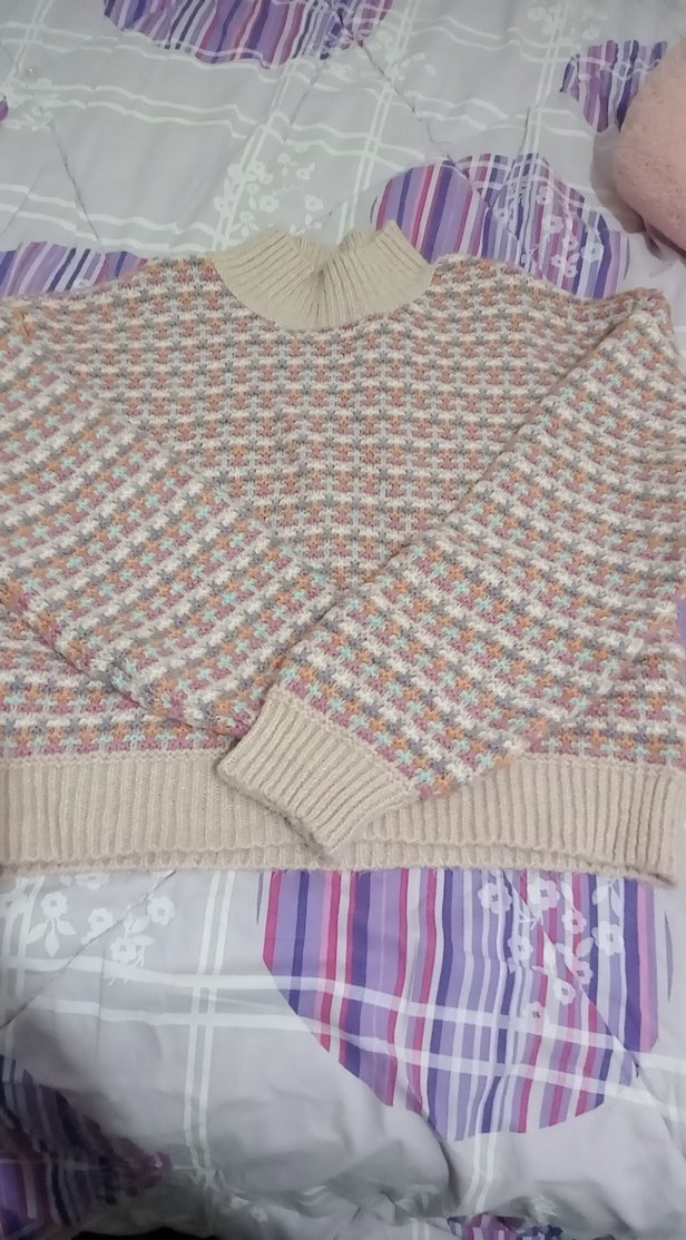 Bohem tarzda, çok renkli pastel triko, boğazlı ve uzun kollu rahat kesim kazak. Günlük kullanıma uygun, normal uzunlukta.