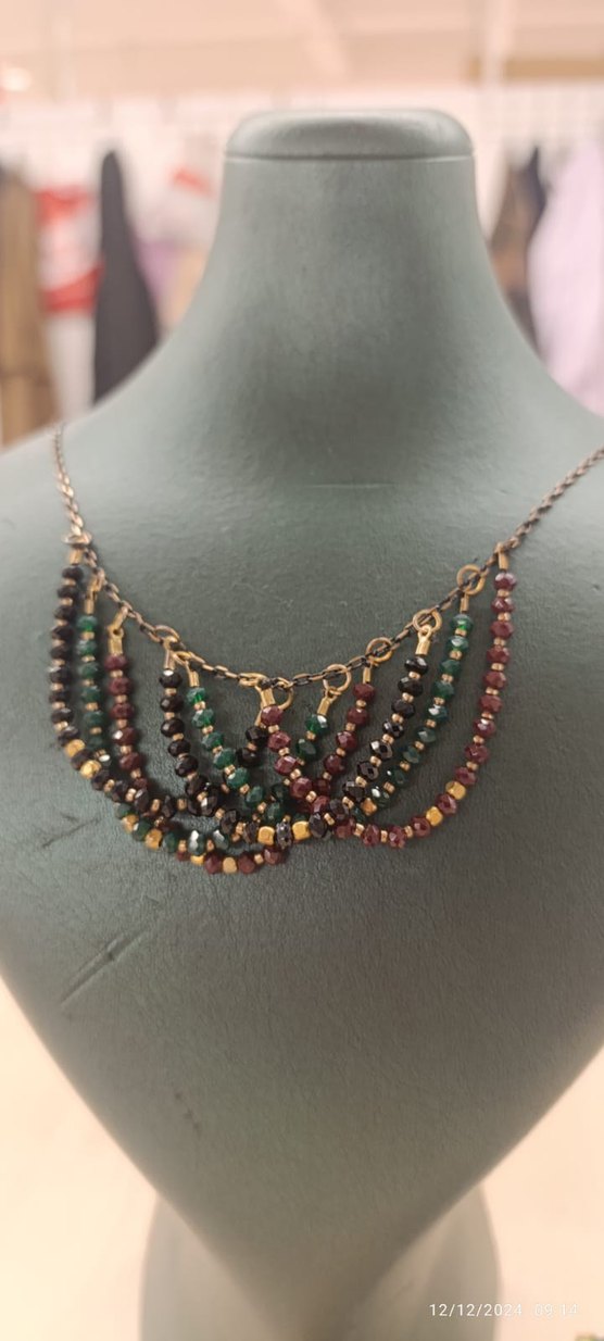 Bohem tarzda, çok renkli boncuklu kısa kolye, nakış desenli, romantik akşamlar için uygun.