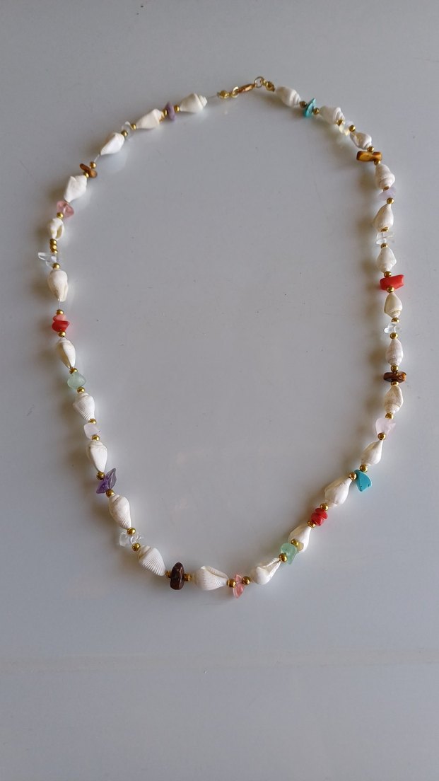 Bohem tarzda, çok renkli boncuklar ve beyaz kabuk görünümlü parçalar içeren normal uzunlukta midi kolye. Günlük kullanım için uygundur.