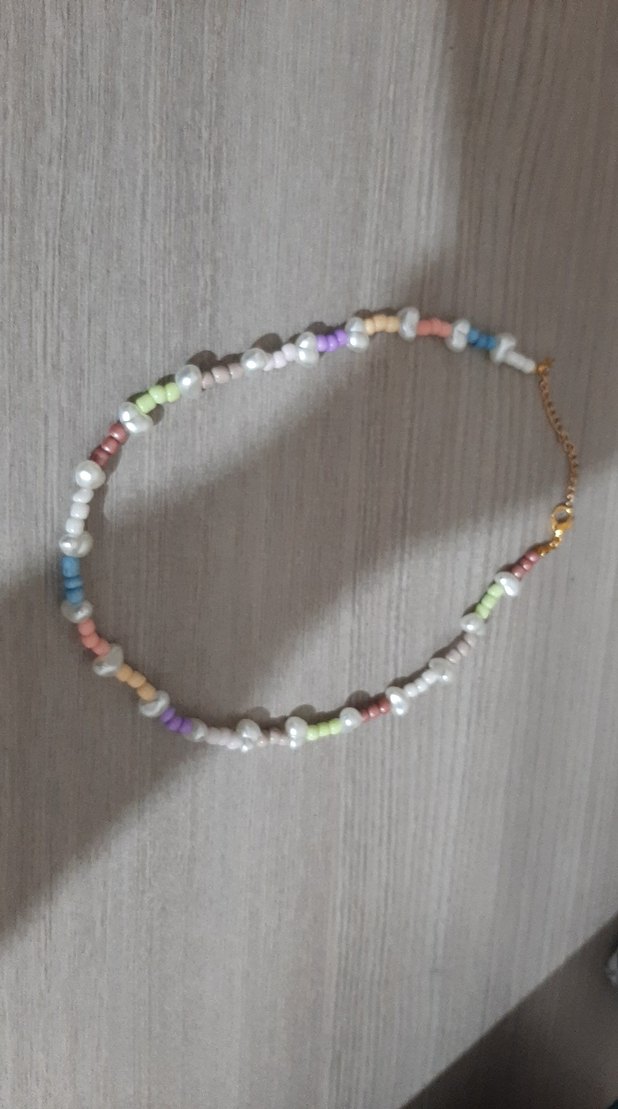 Bohem tarzda, pastel çok renkli boncuklar ve incilerle süslü, bağlama desenli midi kolye, günlük kullanım için uygundur.