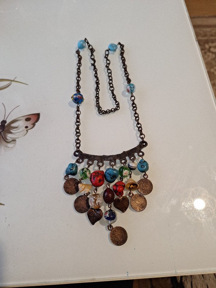 Bohem tarzda, çok renkli boncuklar ve süslemelerle uzun, koyu renk zincirli kolye, günlük kullanım için uygun.