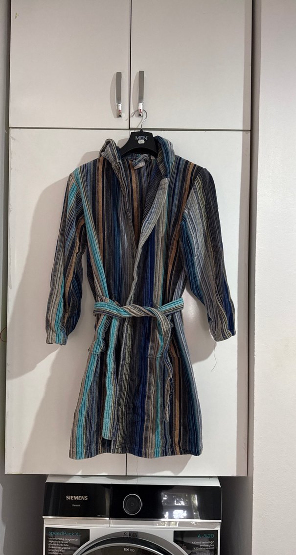 Bohem tarzda, çok renkli çizgili yumuşak kumaştan, belden bağlamalı bornoz. Rahat kullanım için uygundur. Kapşonlu#Bağlama ipinde çok az sökük var #Başka biryerinde hasar yok#Boy 104 cm# İki koltuk arası 61 cm#Marka temsilidir #Markası L&H #Lucy and Home#